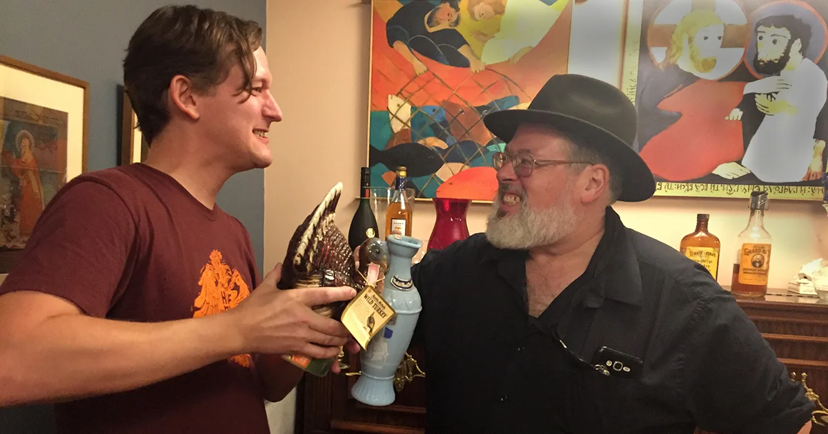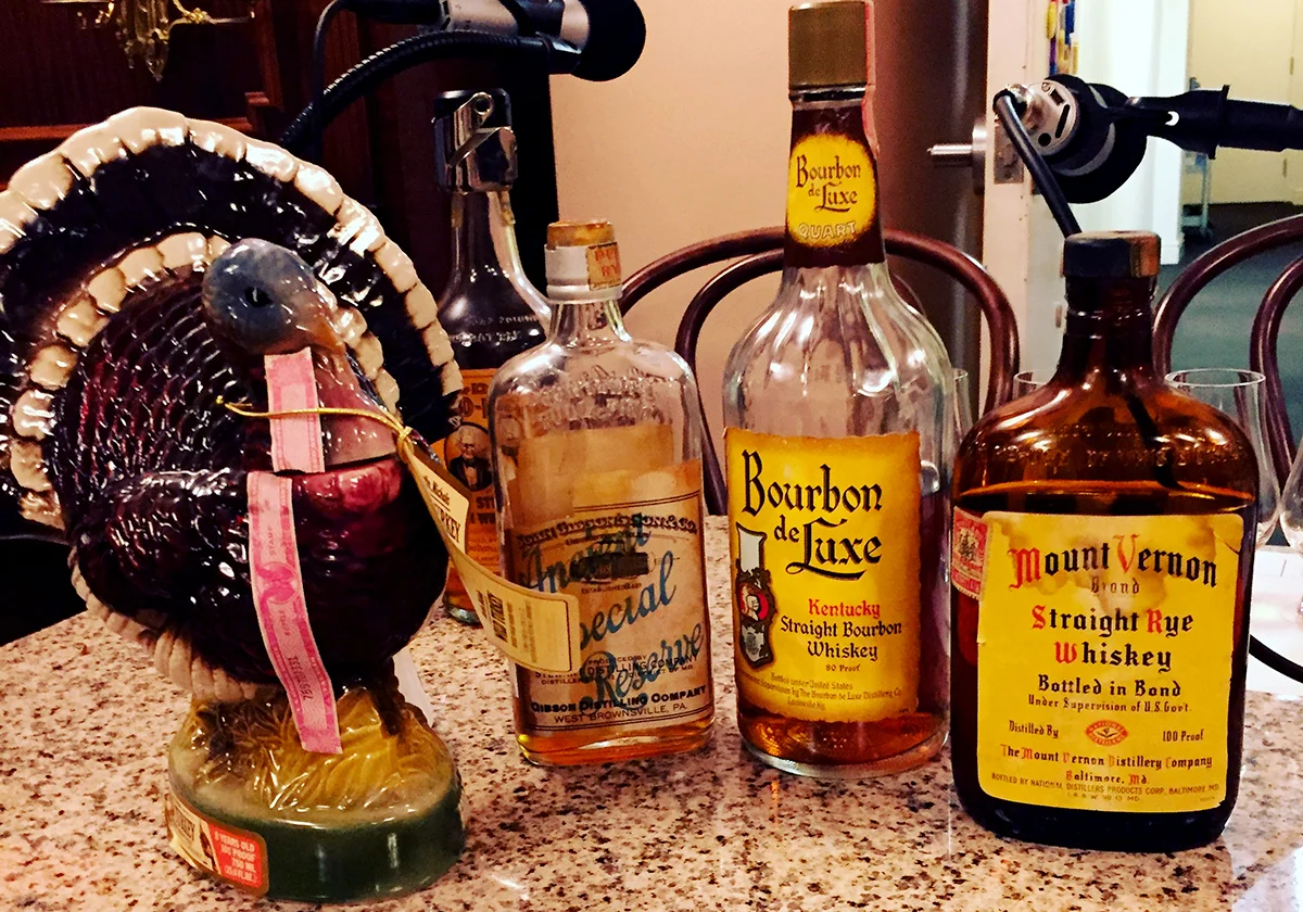Josh Feldman came strong with a John Gibson & Co. Rye which was distilled prior to Prohibition in 1917 but bottled as medicinal whiskey during Prohibition at 11 years old in 1928, and a 1955 Jim Beam, Old Grecian Urn special glass decanter. Josh Richholt brought some serious heat with a 1976 Bourbon de Luxe and a 1978 Wild Turkey 101, 8 Year "Limited Edition Ceramic Strutting Turkey" decanter labeled as, "No. 8 and Final in a Series." So we were all set to face off with some excellent old hooch and some super badass limited edition funky decanters!